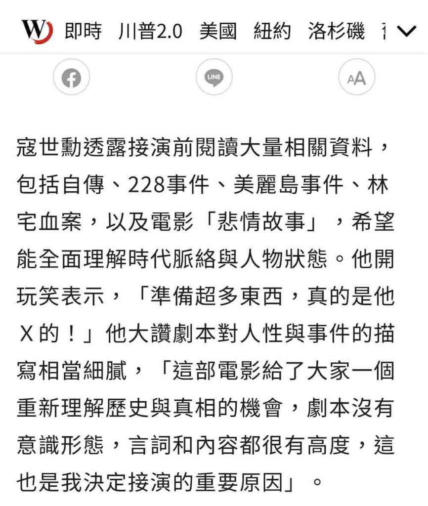 細查了2月1日《世紀血案》記者會的訪談,發現不妙,因為領銜主演的資深演員寇世勳說「劇本沒有意識形態」。